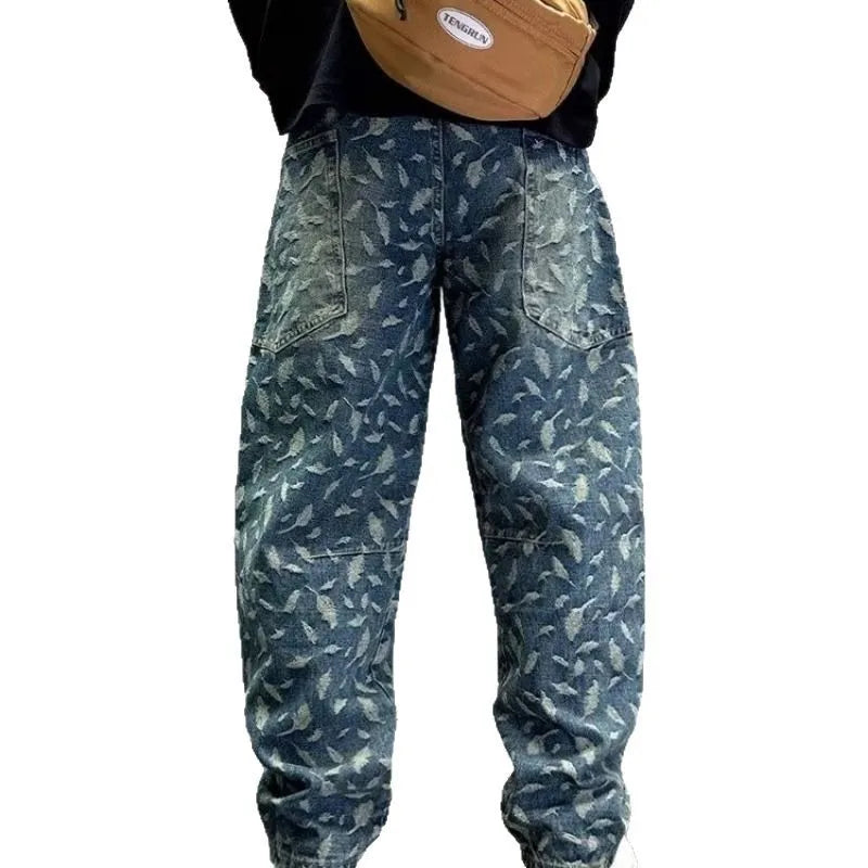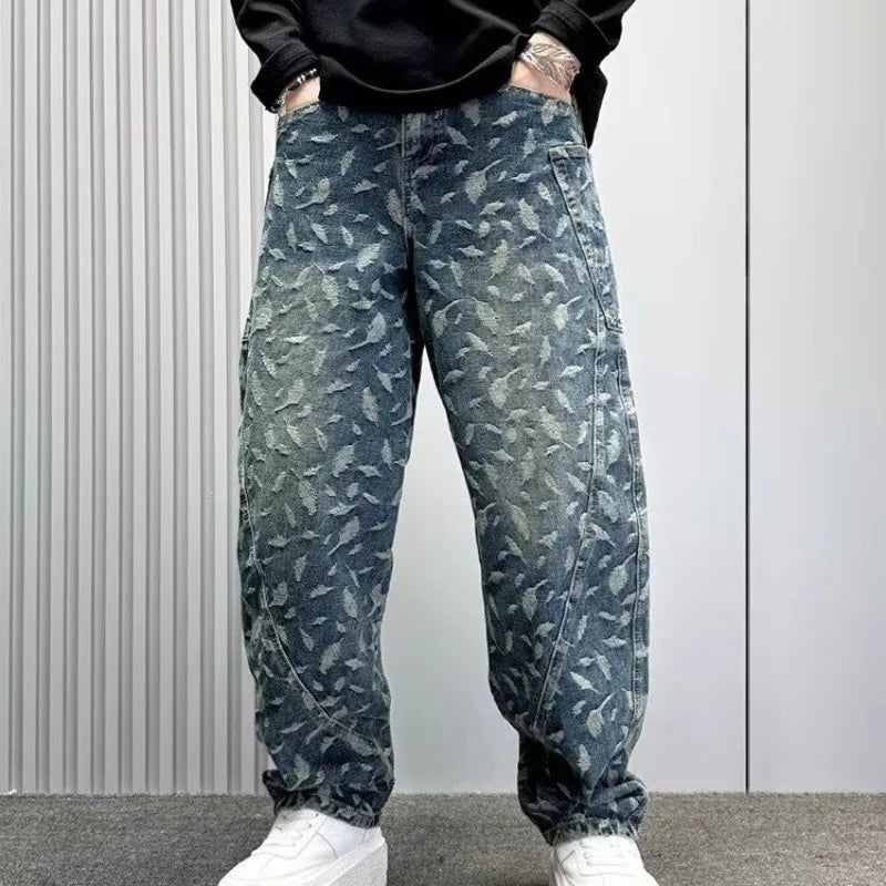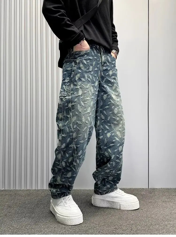 Jacquard Full Print Men's Jeans Retro Straight Loose Trend High Street Scimitar Long Pants 2025 Spring And Summer New